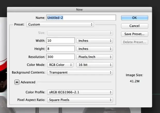 2. Create a new Document. This will allow you to customize the size of the photo itself. Choose File > New, and enter the dimensions you want for your effected image. Im chose to use a 10 inch x 8 inch canvas (but of course you can enter whatever dimensions you need for your project). For the Resolution, I used a print resolution of 300 pixels/inch.