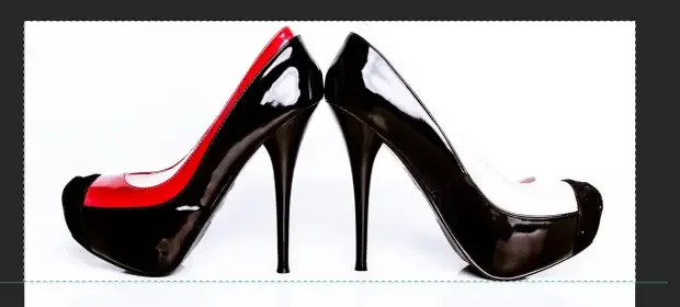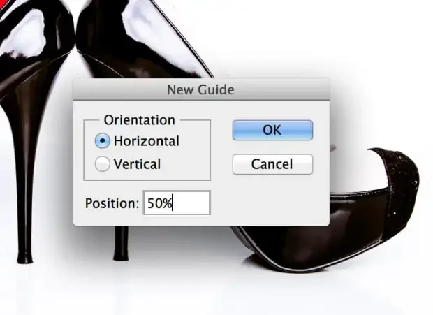 Now comes the fun part, we can now add a guide to help to start the mirror process. Choose View > New Guide. You can either choose vertical or horizontal depending on your image. I also, by habit, always type in 50% for the position as a starting point. I am choosing horizontal so I can mirror the heels to create a reflective surface.