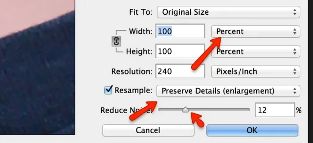 When the dialog box appears you will notice you have some options. Personally I like to switch to percent so I can judge more efficiently how much larger I’m making the file. Some recommendations say to adjust 10% at a time. Next play with re-sample drop down options. For me, preserve details worked the best. You can try that or bicubic smoother and use the preview pane to judge which one works the best for you. Then adjust your reduce noise as needed.